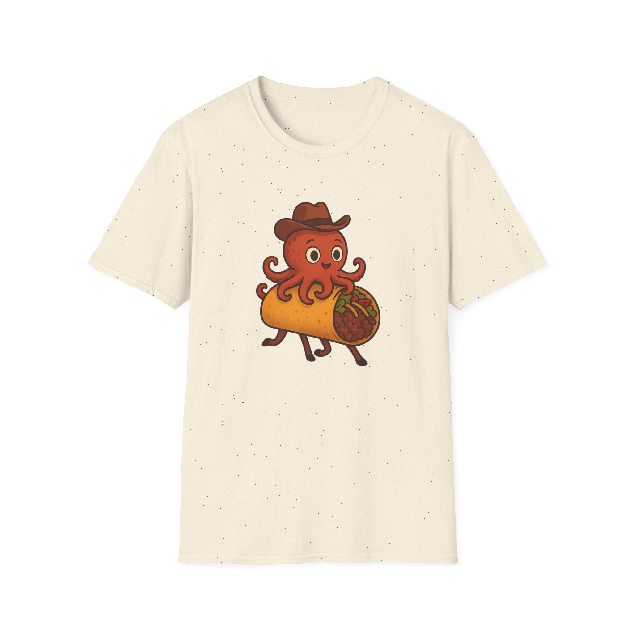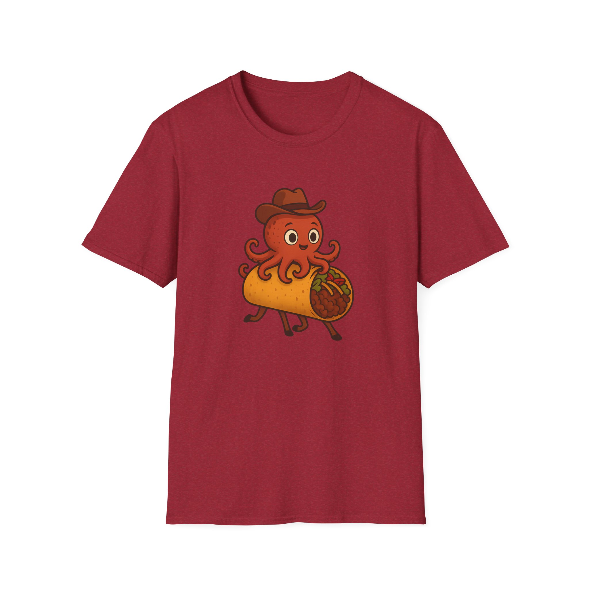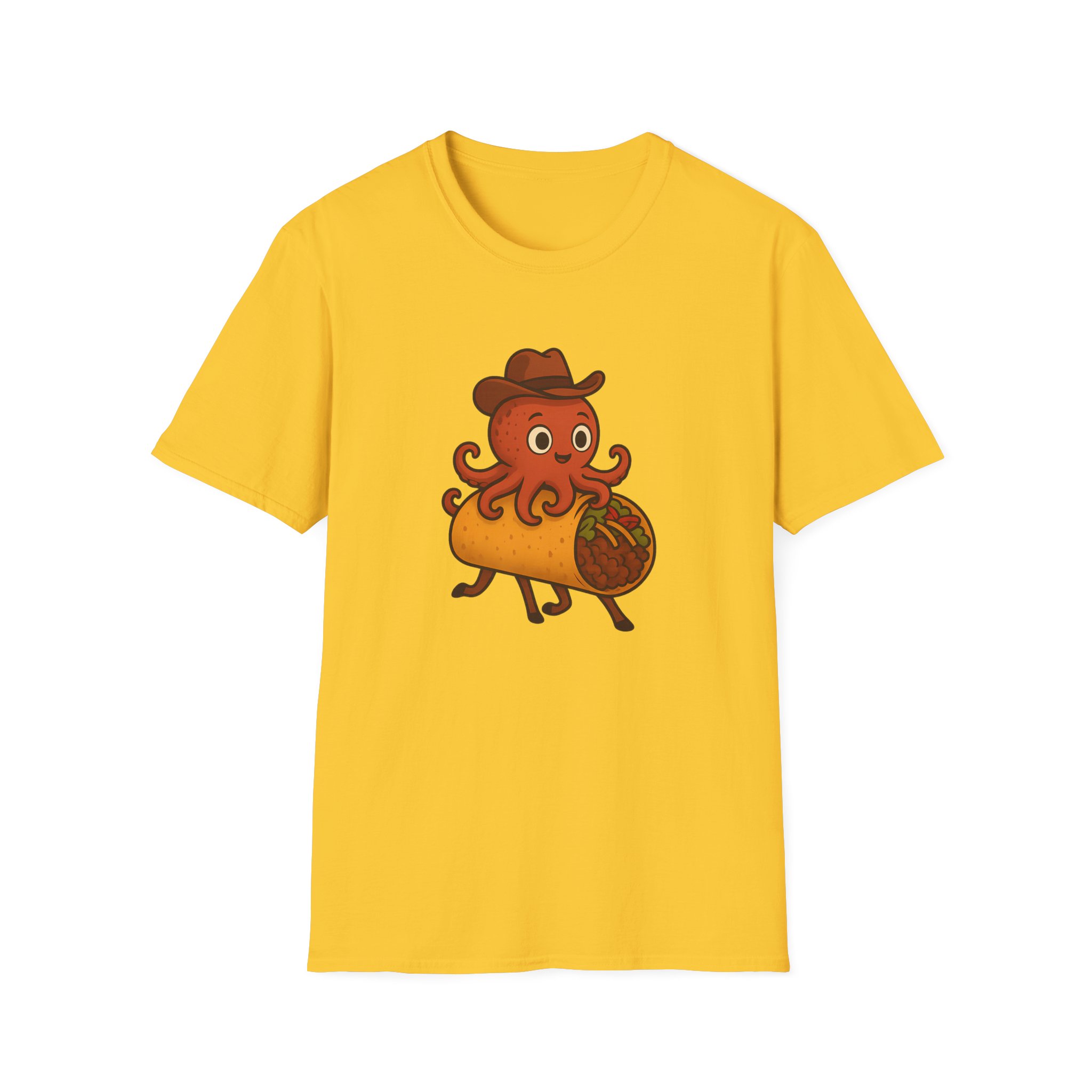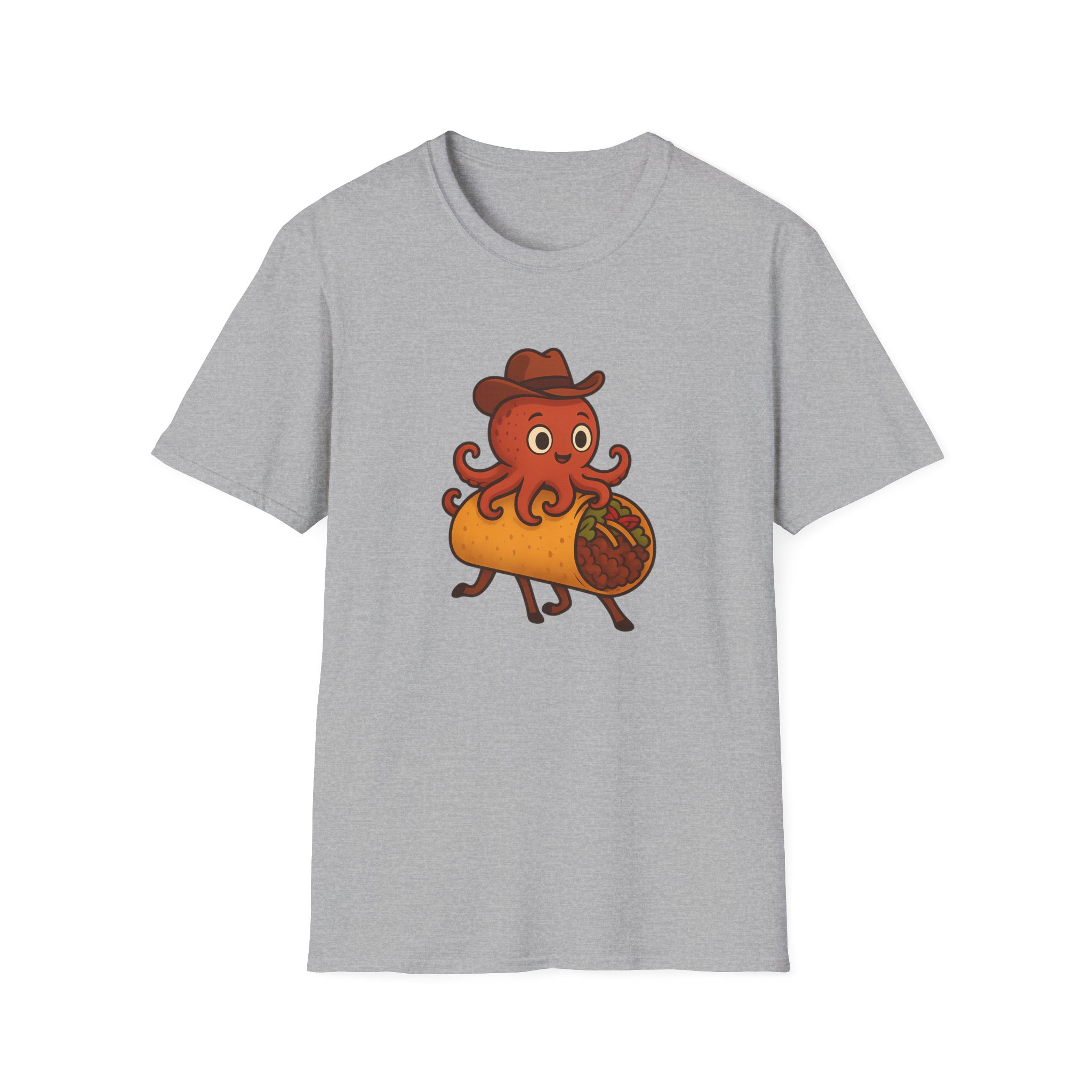 Featuring a one-of-a-kind design of a cowboy-hat-wearing takoyaki octopus riding a taco with horse legs, this shirt is the perfect blend of fun and absurd. Made from soft, 100% ring-spun cotton, it offers unbeatable comfort for all-day adventures, whether you’re at a party, a family reunion, or just lounging at home.