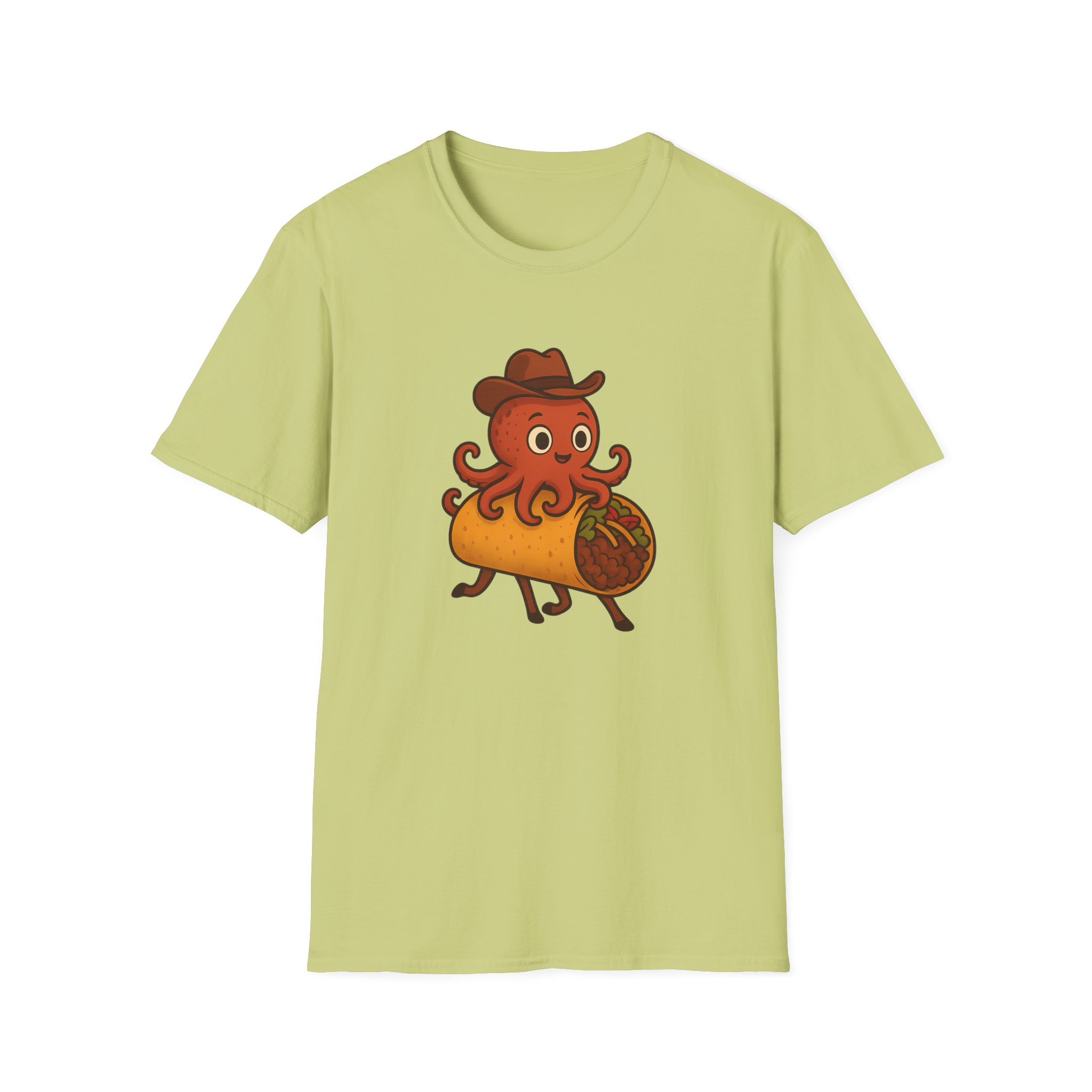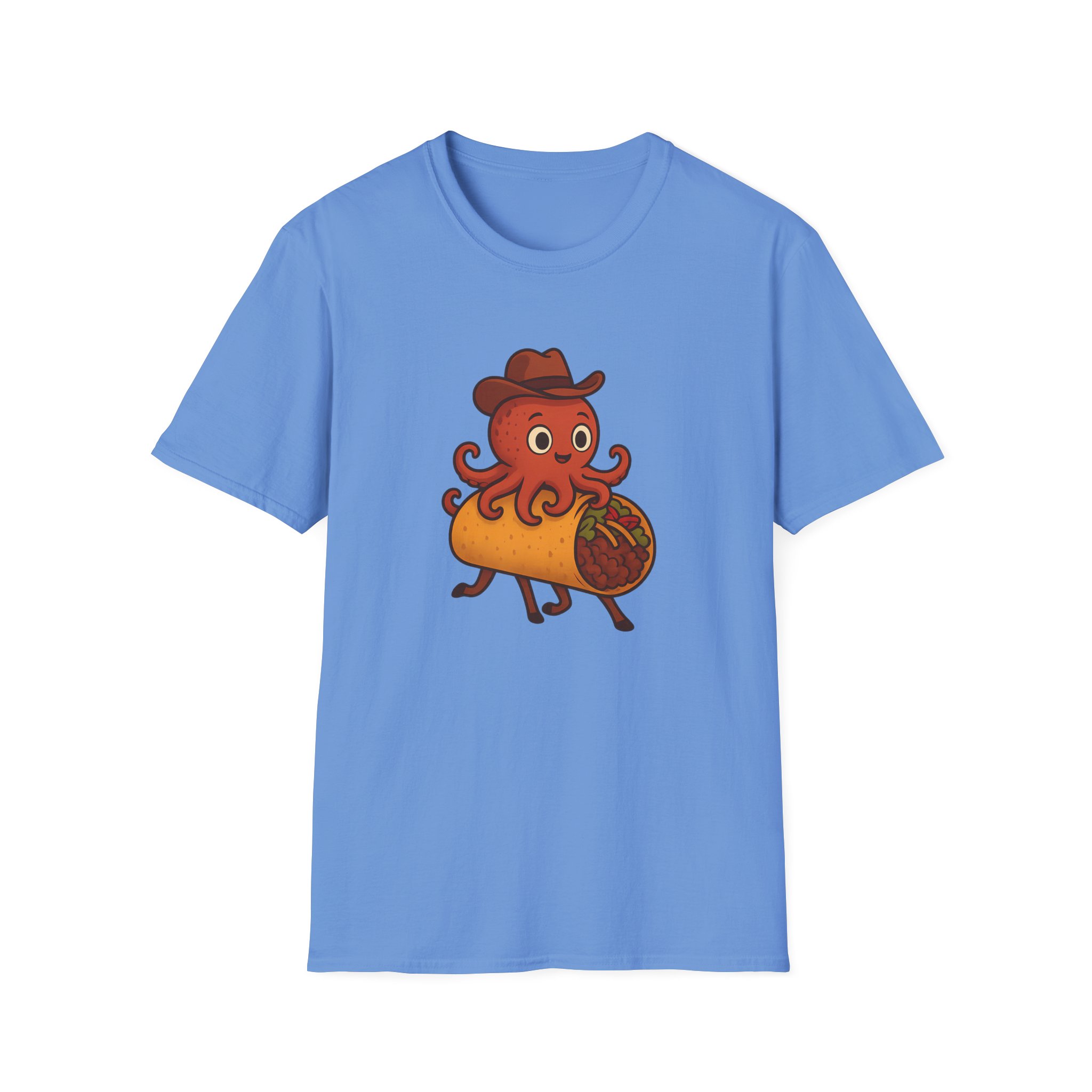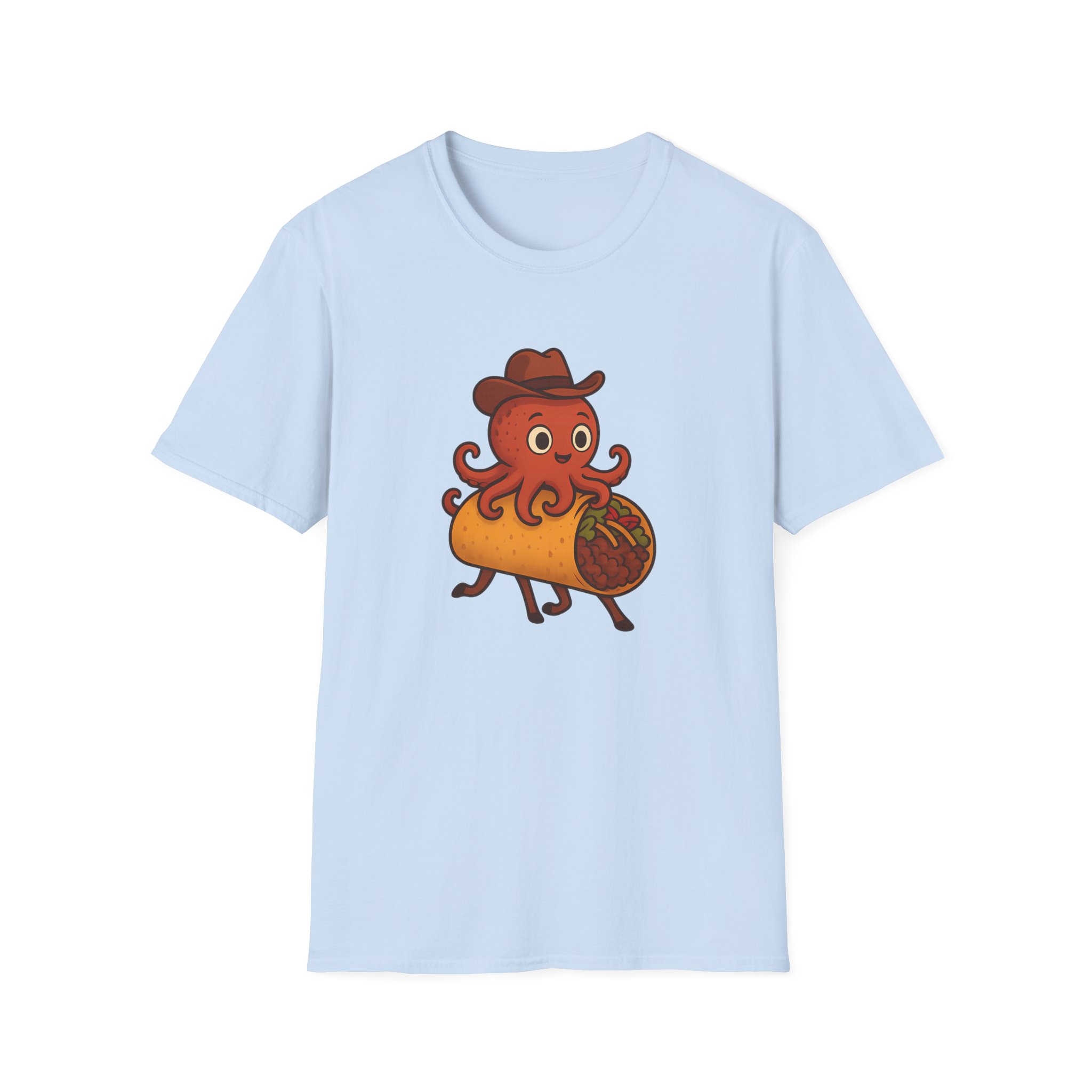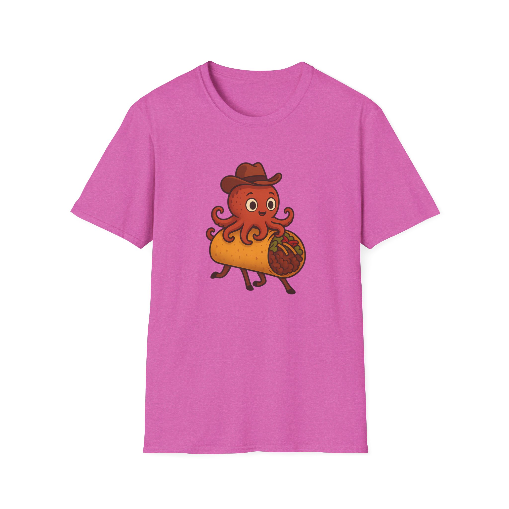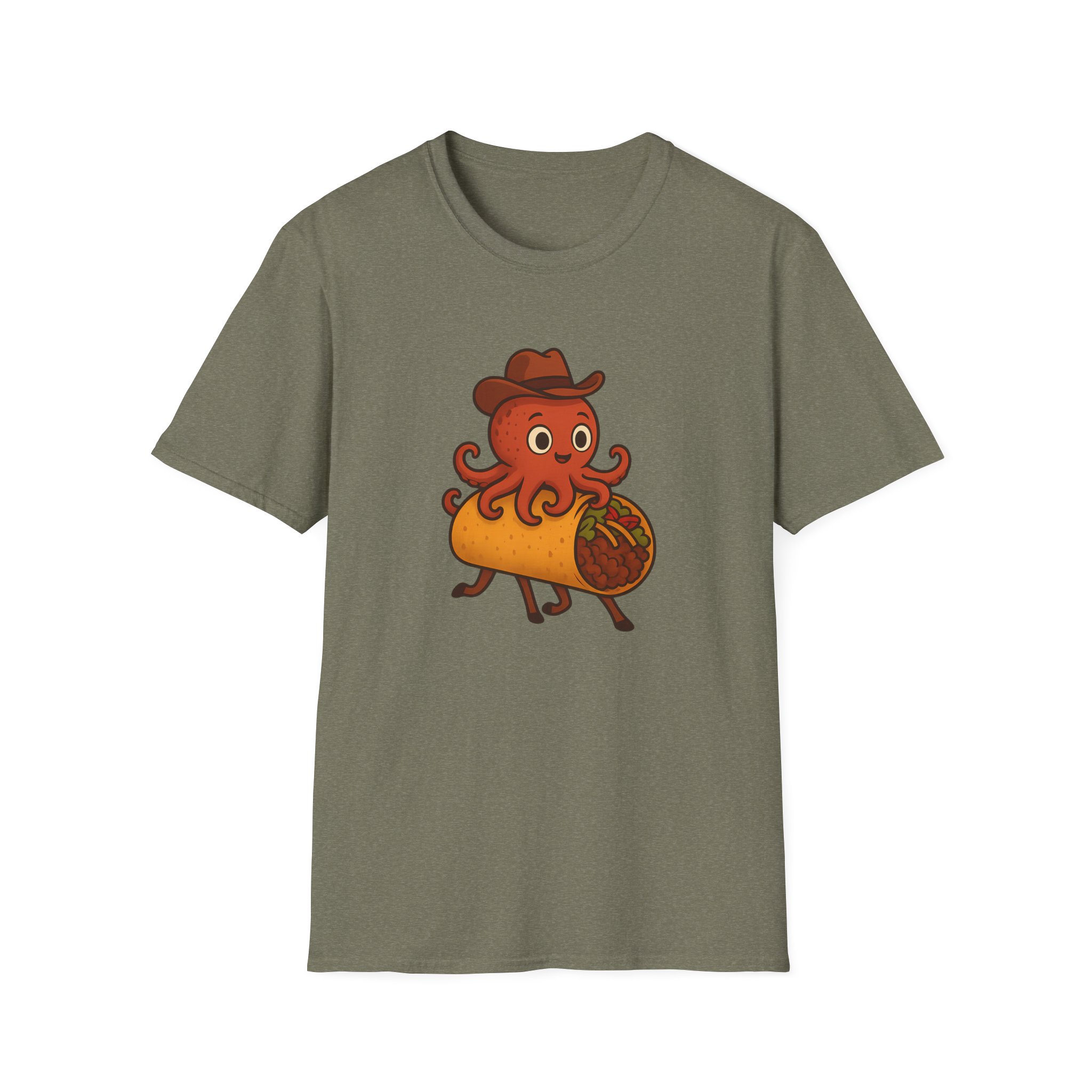 Featuring a one-of-a-kind design of a cowboy-hat-wearing takoyaki octopus riding a taco with horse legs, this shirt is the perfect blend of fun and absurd. Made from soft, 100% ring-spun cotton, it offers unbeatable comfort for all-day adventures, whether you’re at a party, a family reunion, or just lounging at home.